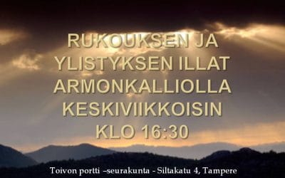 Rukouksen ja ylistyksen illat keskiviikkoisin klo 16:30 kesä 9, 2025 RUKOUKSEN JA YLISTYKSEN ILLAT Rukouksen ja ylistyksen illat jatkuvat jälleen 7.1.2026 keskiviikkoisin klo 16:30. Tervetuloa!