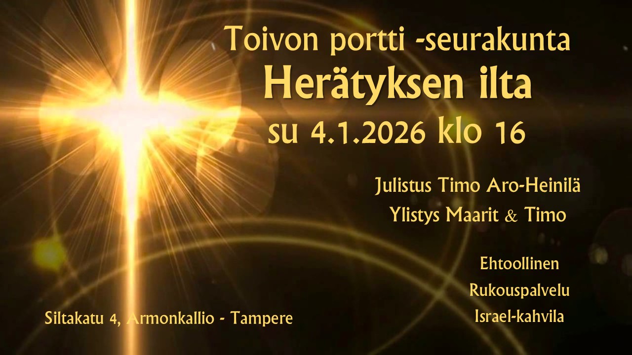 Vuoden 2026 ensimmäinen Herätyksen ilta. Julistus Timo Aro-Heinilä; ylistys Maarit & Timo. Ehtoollinen. Rukouspalvelu. Israel-kahvila. Tervetuloa!